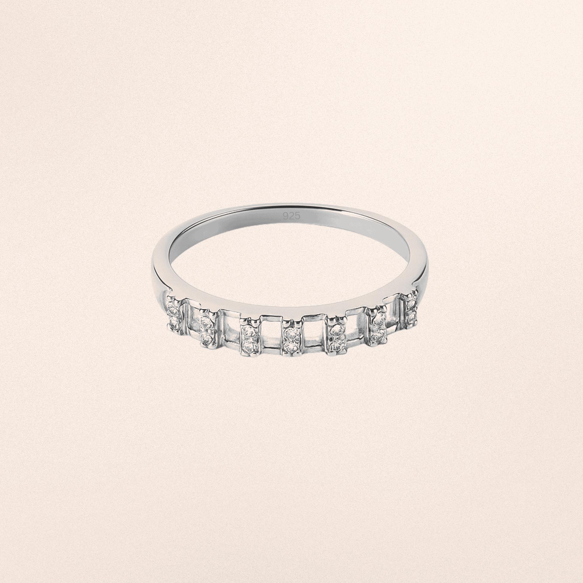Modern 925 Sterling Silver band ring with alternating rectangular bars and CZ stones. Sleek, minimalist design perfect for stacking or wearing solo, offering timeless elegance and lasting shine.