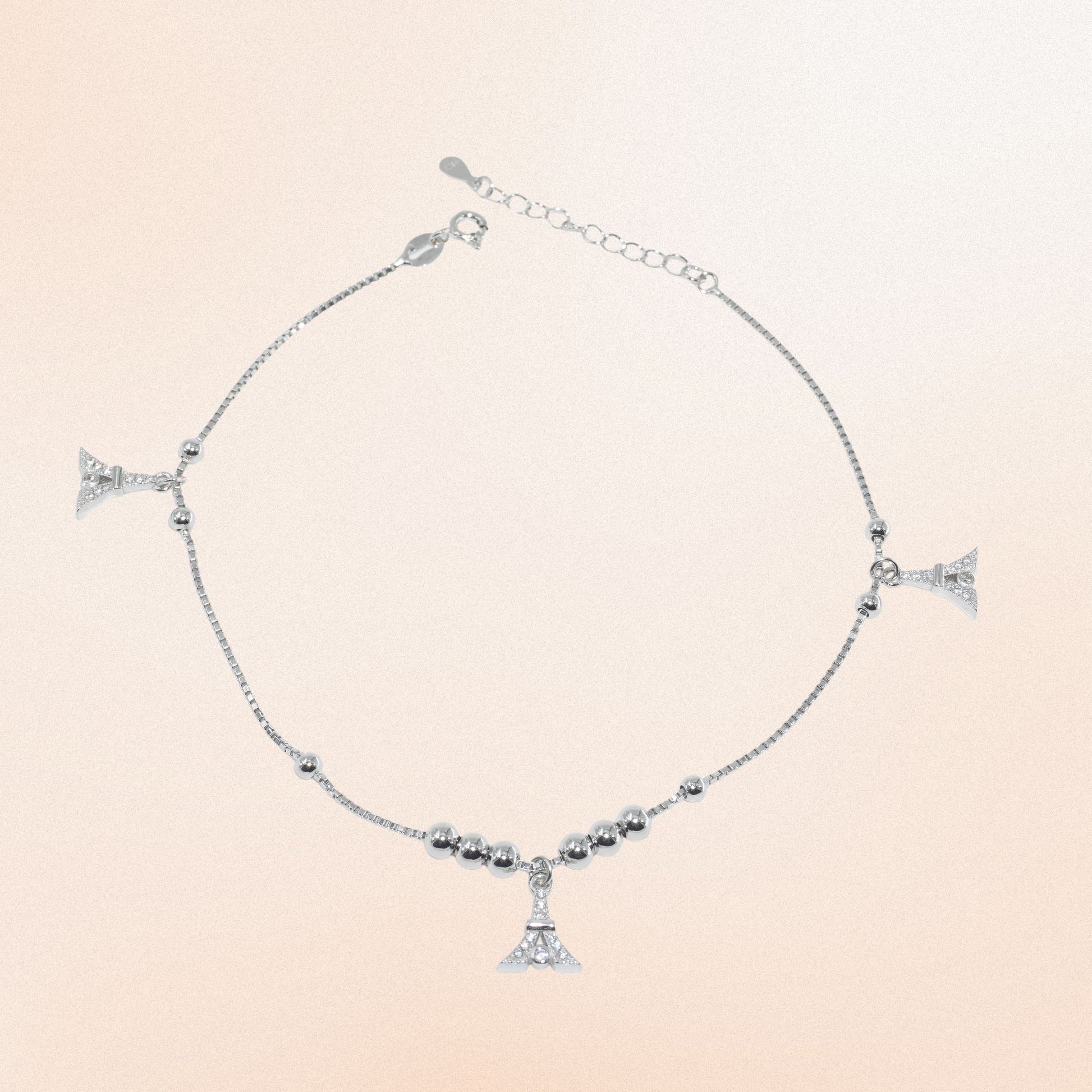 Elegant 925 sterling silver anklet with Eiffel Tower charms, beads and box chain. Adjustable fit, hypoallergenic, anti-tarnish—ideal for daily wear or gifting.